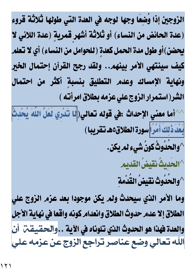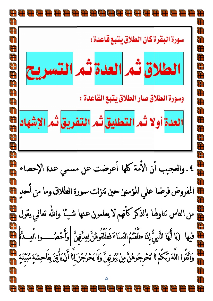 سورة الطلاق الجامعة المانعة لأحكام الطلاق إلي يوم القيامة ومغزي قول الله تعالي(يَا أَيُّهَا النَّبِيُّ إِذَا طَلَّقْتُمُ النِّسَاءَ فَطَلِّقُوهُنَّ لِعِدَّتِهِنَّ وَأَحْصُوا الْعِدَّةَ وَاتَّقُوا اللَّهَ رَبَّكُمْ لَا تُخْرِجُوهُنَّ مِنْ بُيُوتِهِنَّ وَلَا يَخْرُجْنَ إِلَّا أَنْ يَأْتِينَ بِفَاحِشَةٍ مُبَيِّنَةٍ وَتِلْكَ حُدُودُ اللَّهِ وَمَنْ يَتَعَدَّ حُدُودَ اللَّهِ فَقَدْ ظَلَمَ نَفْسَهُ لَا تَدْرِي لَعَلَّ اللَّهَ يُحْدِثُ بَعْدَ ذَلِكَ أَمْرًا